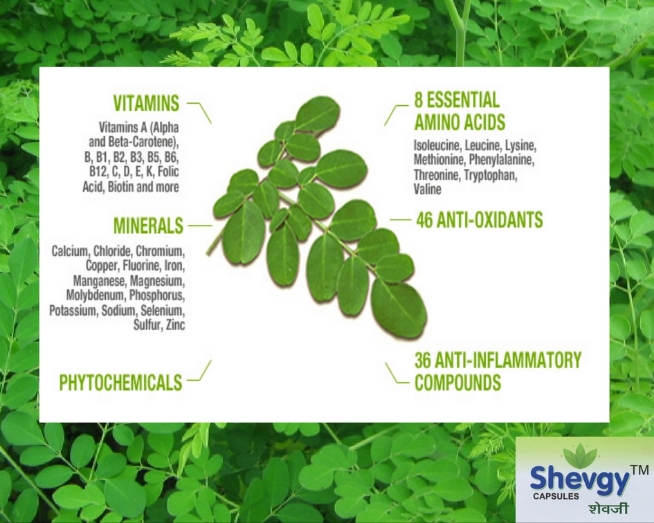 Shevgy ( Moringa Oleifera ) is full of vitamins & minerals. Shevgy contains all essential amino acids. Shevgy is rich in anti-oxidant property and contains 46 anti-oxidants. Shevgy has strong anti-inflammatory properties with 36 anti-inflammatory compounds.
